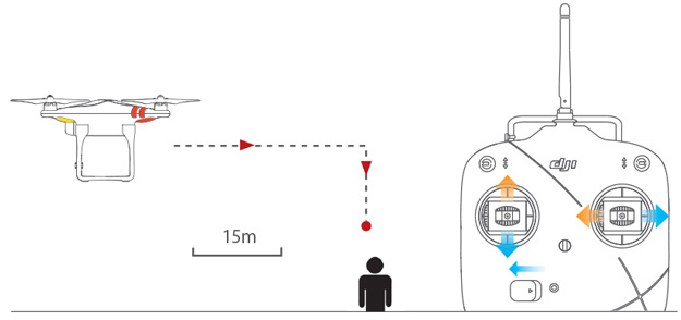 図のようにPhantomの高度を離陸点から15mまで離し、送信機をオフにしてください。