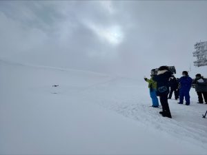 飛行の実証は、旭岳ロープウェイに乗り中腹から山頂にかけた一面、深い雪に覆われ